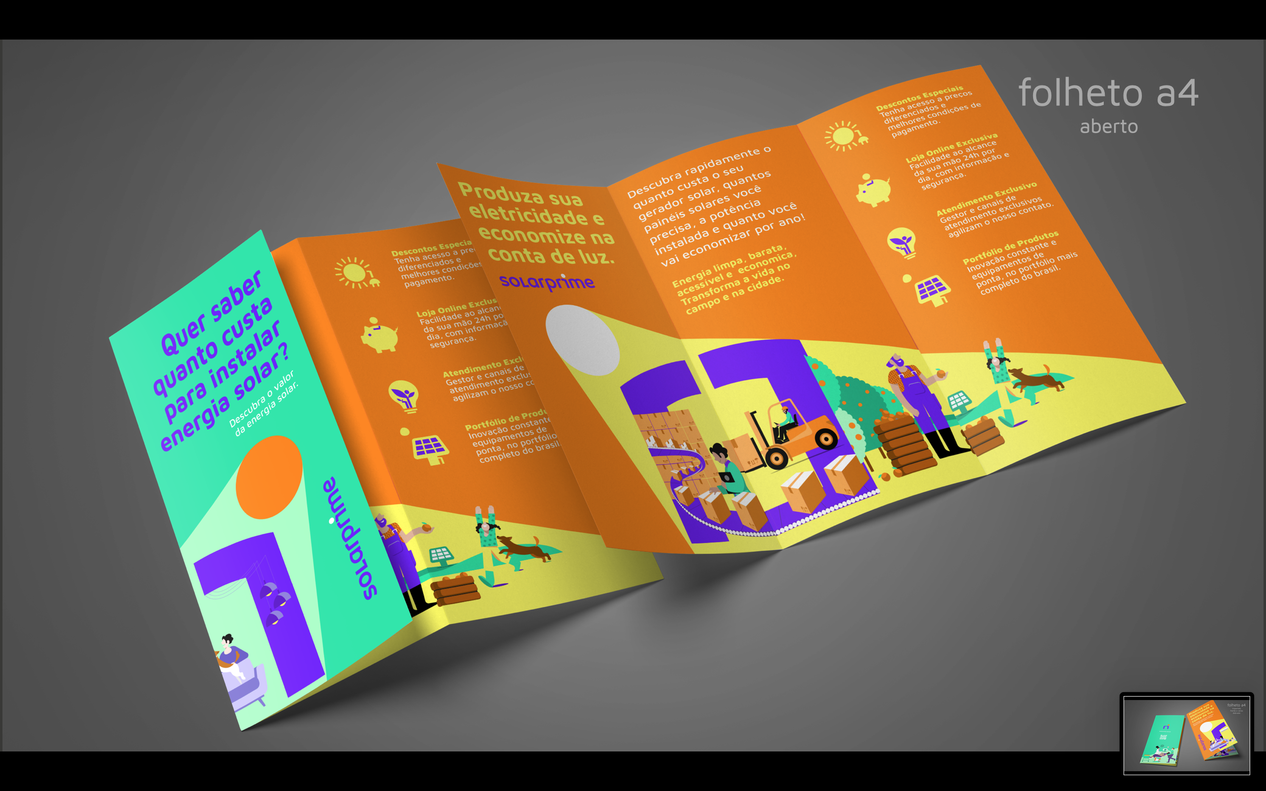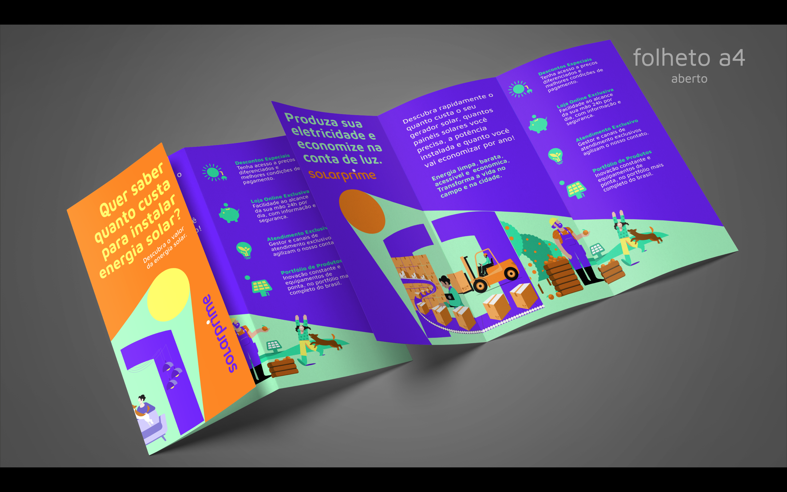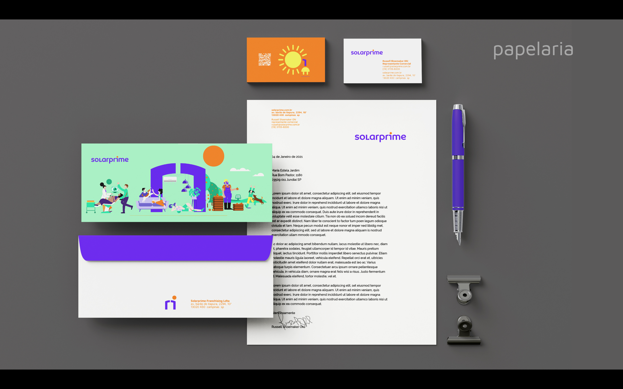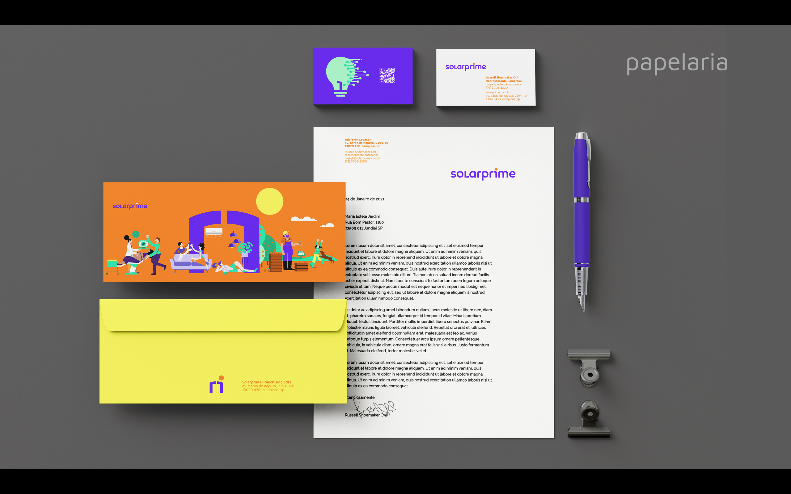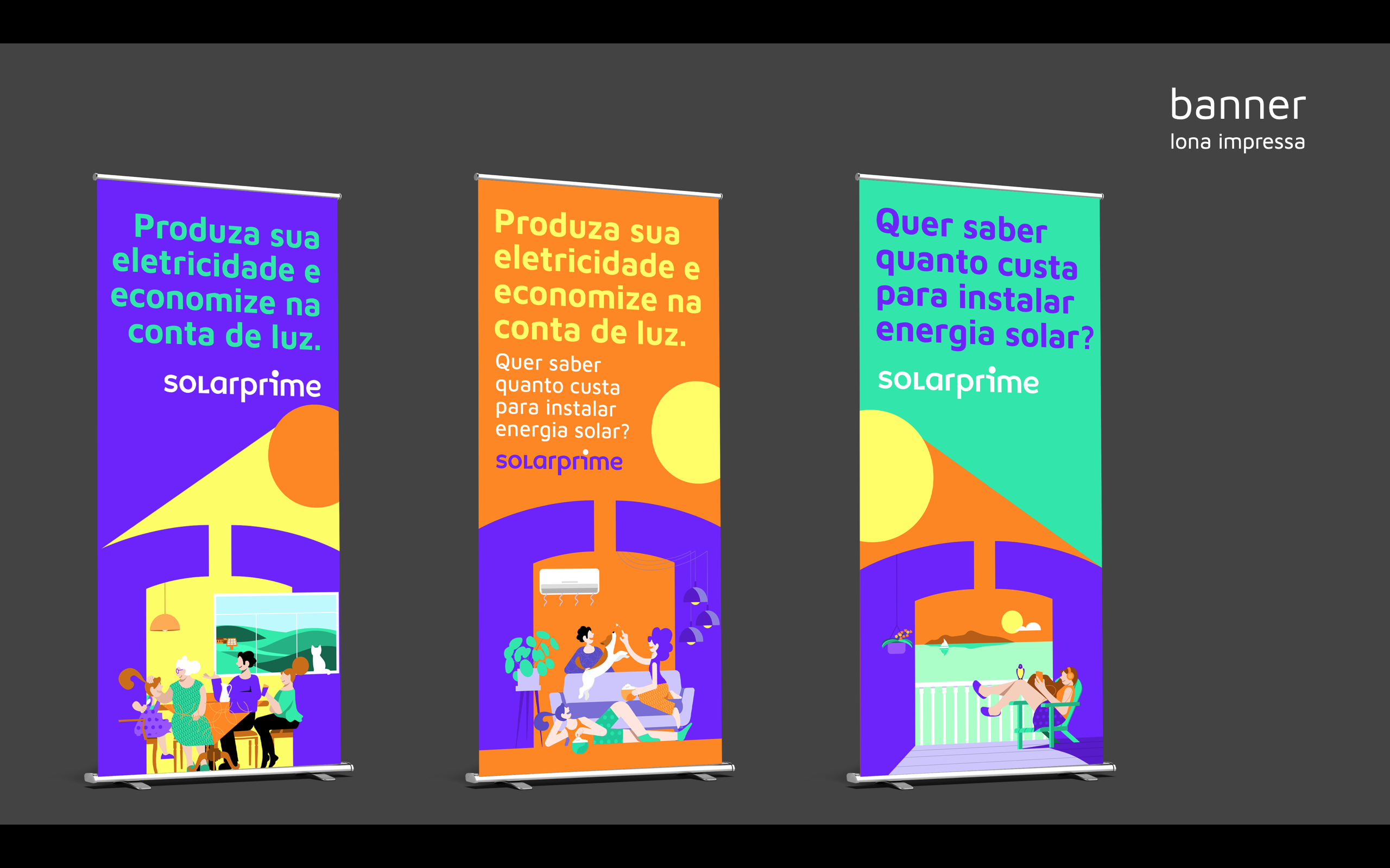 Partindo do branding e da marca criada pelo estúdio Ana Couto, criamos uma série de ilustrações personalizadas e diversas peças de comunicação interna e externa, que foram adotadas na construção da nova identidade visual corporativa da Solarprime.